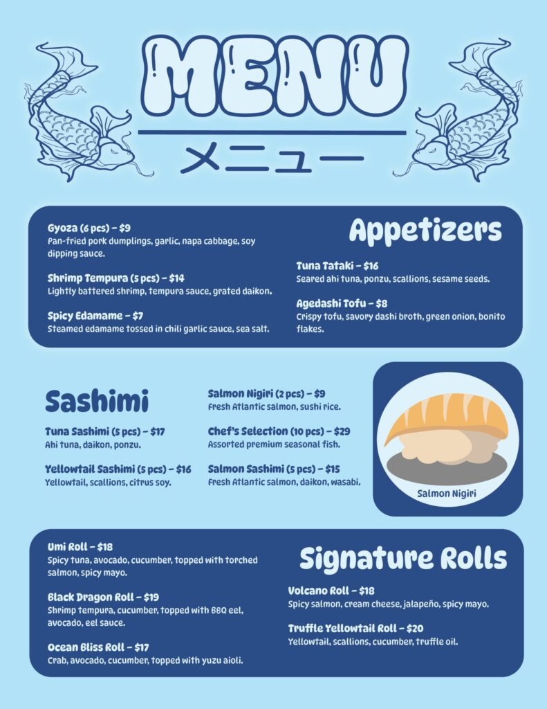 I designed a clean, modern sushi restaurant menu that organizes items clearly while highlighting key dishes through balanced layout, typography, and visual hierarchy.
