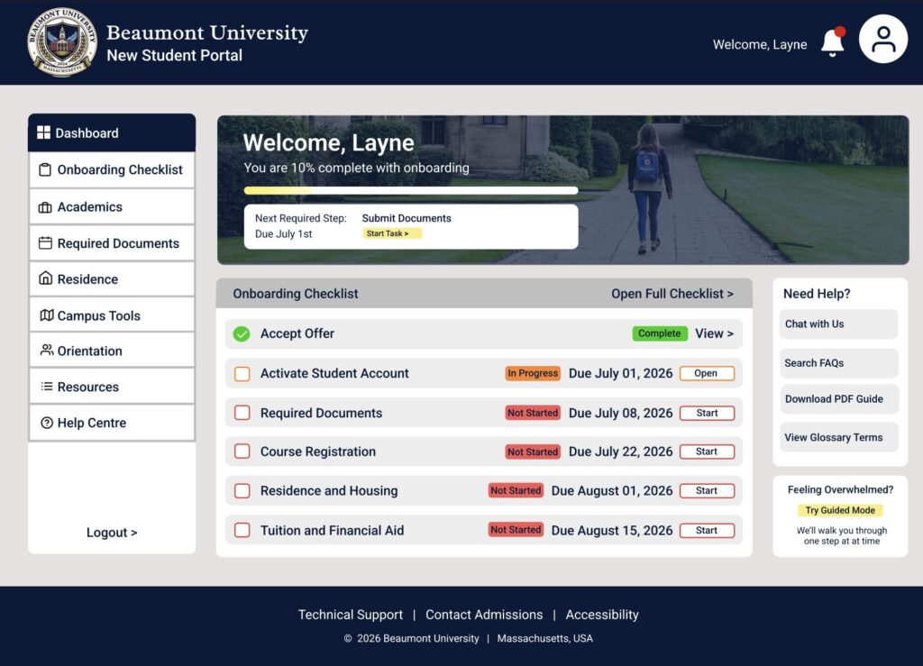 I designed an intuitive onboarding portal that guides new university students through essential setup steps using a structured checklist, clear instructions, and accessible UX writing.